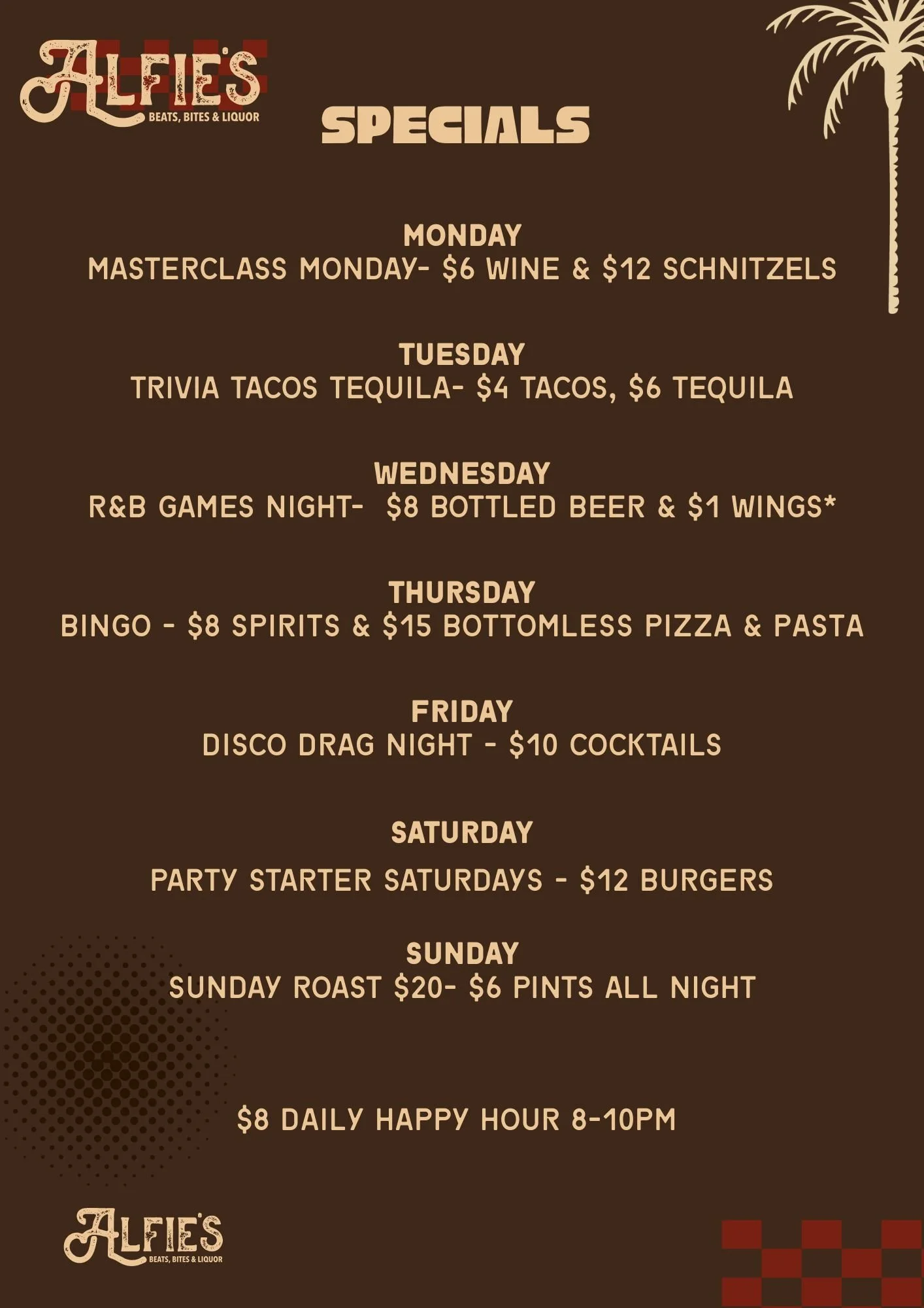 PLUS NIGHTLY FOOD AND DRINK SPECIALS SO YOU CAN COME FOOR A GOOD TIME AND STAY FOR A LONG TIME